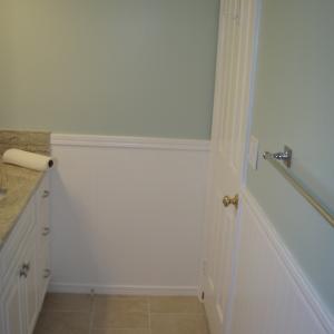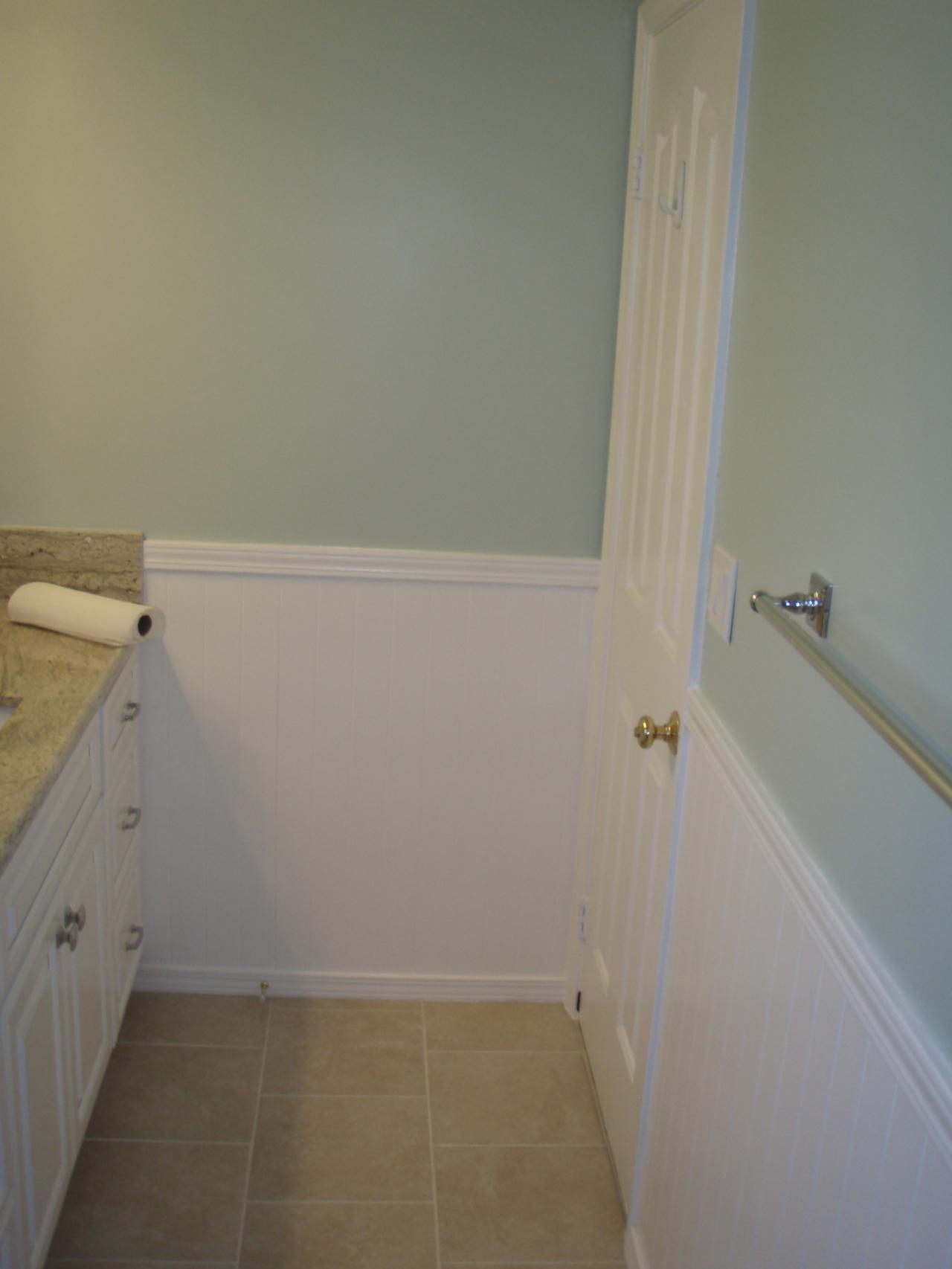 This is a bathroom remodel on the 2nd floor of a townhome in North Redondo where we removed everything and then added a new shower stall, custom single sink vanity, fan, toilet, and wainscotting on walls.Room was approximately 5ft x 12ft.